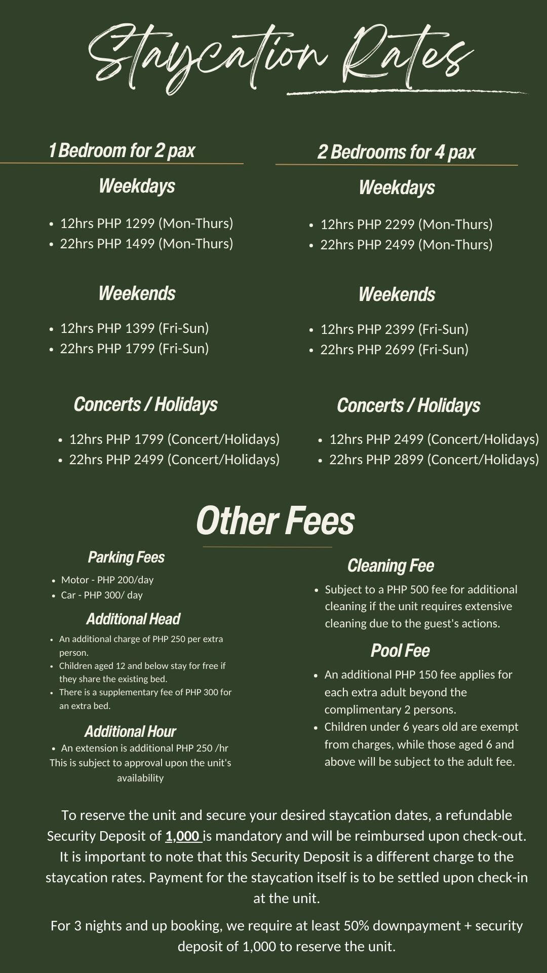 In order to confirm the reservation of the unit and secure your desired staycation dates, a